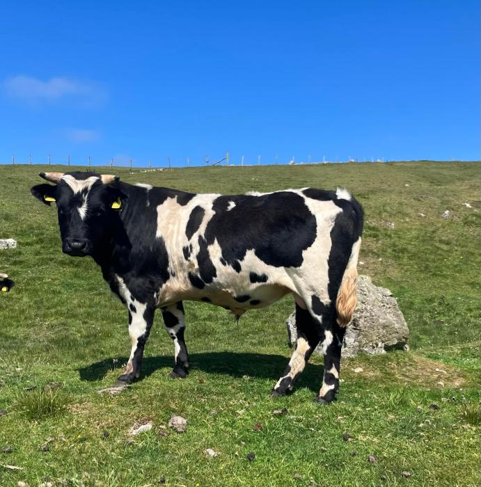 The kye are kept in the traditional way in winter, being stall tied in the byre. The aim is to get calving done before turnout in spring. There are all sorts of colours in the Hjem herd, but by preference Laurie would go for black or grey/blue, solid coloured and with black feet. Flecked legs are another plus. Having said that about preferring black animals, the Hjem herd had its first 2024 calf just a day ago - he's a pure white bull calf, certainly solid coloured and out of a blue & white cow by a blue bull; an unusual one!