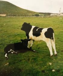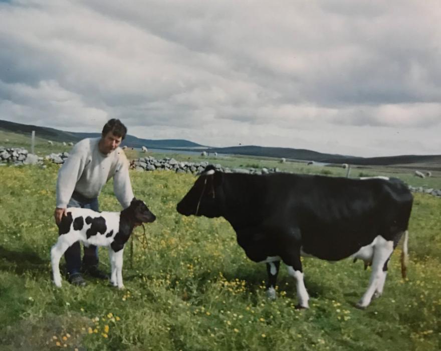 The Hjem herd was first started by Laurie's Grandfather, John Robert Manson, not long after taking over the croft from Maggie Murray. Maggie did have a Shetland cow on the croft but, unfortunately, it was sold away and didn't stay with the croft. The Hjem (pronounced Haym and meaning home) herd was originally started with a couple of Shetland cross cows from John's aunt in Orkney. By 1986 though, the Hjem herd was registered with the Shetland Cattle Herd Book Society after the purchase of his first pure bred registered Shetland Cow from Bertie Moar of Murrister. That first cow, the foundation of the Hjem herd, was Murrister Jane. Murrister Jane went on to give the herd two heifers, Hjem Annie and Hjem Hannah - both by Murrister Pete. Hjem Annie went on to produce Hjem Lowrie (by Boxmoor Fearless) in 1990 who ended up with 60 projeny registered in the herd book for the Lewis, Easterhouse, Islesburgh, Houlland, Fetlar, Littlester, St Trinians and Tollesbury Wick herds. Quite a Hjem legacy! Hjem Lowrie's last calf was registered in 2003.